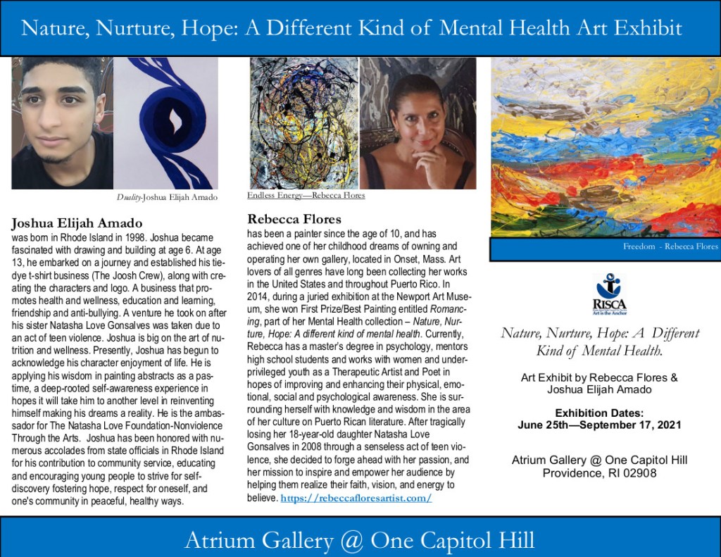 An Art exhibition, showcasing the work of a Rebecca Flores-Artist and her son Joshua Elijah Amado, is on display at the Atrium Gallery, One Capitol Hill, Providence, RI. The exhibition, which opened this month will be displayed until September.